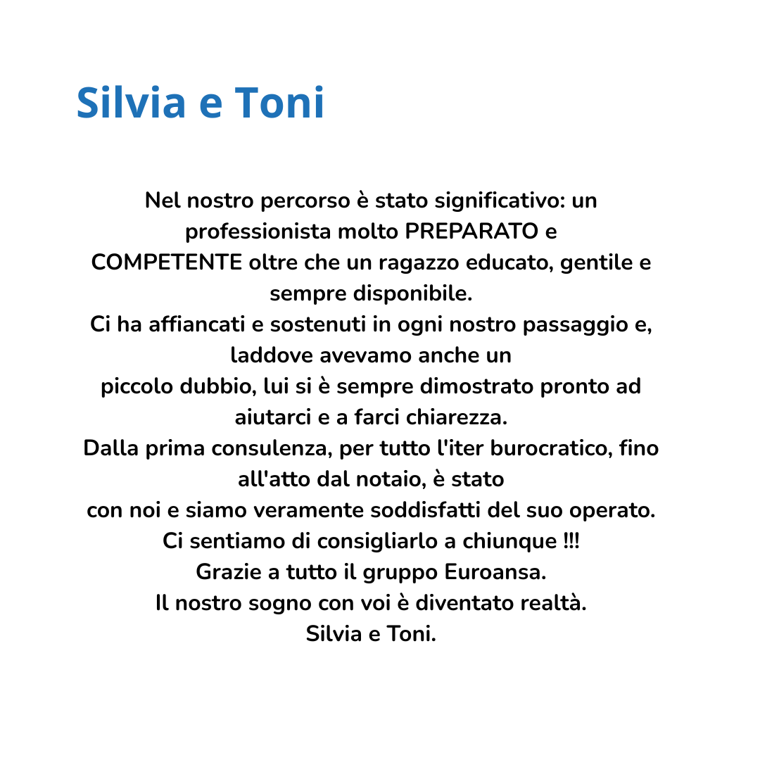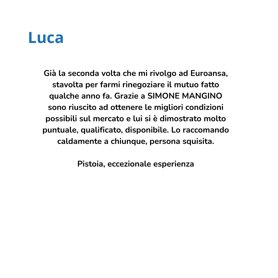 Sono Simone, un consulente esperto che lavora con Euroansa, una delle principali società di mediazione creditizia in Italia. Grazie alla mia esperienza e alla collaborazione con oltre trenta istituti bancari, aiuto privati e aziende a realizzare i loro obiettivi finanziari, proponendo soluzioni personalizzate e su misura per ogni esigenza.